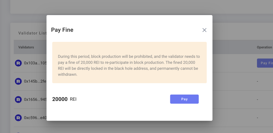 During this period, block production will be prohibited, and validators can choose to pay a fine of 20,000 REI to re-participate in block production. The fined 20,000 REI will be directly locked in the black hole address, and permanently cannot be withdrawn. Validators can also choose to withdraw all tokens and quit the node election, during this period, the tokens and node rewards staked by users and nodes will not be affected, and they can be freely withdrawn or reinvested in other nodes.